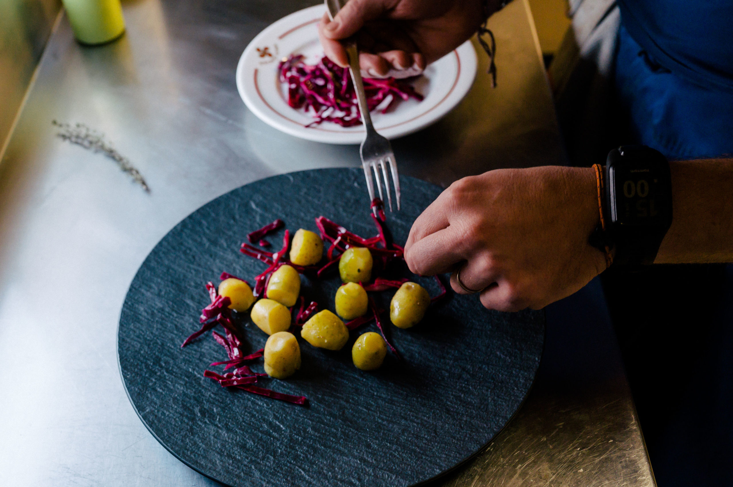 Tailler le choux rouge en l’éminçant très finement. Faire chauffer le vinaigre et le verser sur les choux. Le mélanger vivement et filmer le contenant. Laisser reposer le choux pendant 10/12 min, c’est le vinaigre chaud qui permet de le cuire à peine et y rajouter à la fin un trait d’huile d’olive et l’ail émincé finement.